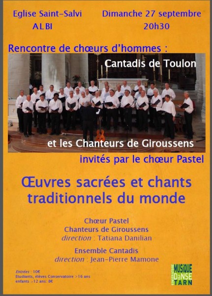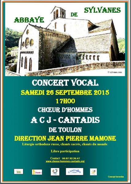 Le 24 septembre le Choeur d'Hommes CANTADIS entamera une tournée en pays Aveyronnais avec un premier concert à MILLAU le Vendredi 25 septembre à 20h30 Salle René Rieux, avec la chorale locale POLY'SONGS, puis un second concert en la prestigieuse Abbaye de SYLVANES le Samedi 26 septembre à 17h00, et enfin un ultime concert à ALBI, église Saint Salvi, le Dimanche 27 septembre à 20h30 avec la chorale locale PASTEL et LES CHANTEURS DE GIROUSSENS.