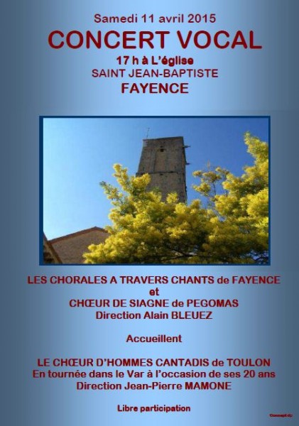 Il partageront ce concert avec la chorale de FAYENCE "A Travers Chants" et "Choeur de Siagne" de PEGOMAS, placés sous la direction de Alain BLEUEZ.