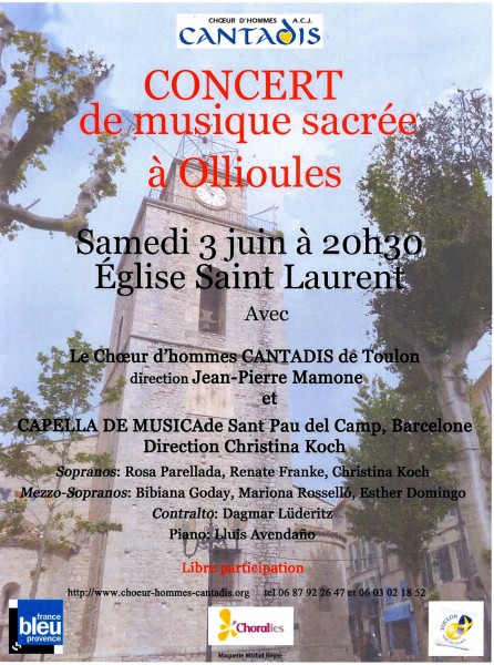 Ce concert sera donné en l'église St Laurent d'Ollioules, le Samedi 3 juin 2017 à 20h30 en partenariat avec l'excellent choeur féminin catalan Capella de Musica de San Pau Del Camp, avec qui le choeur Cantadis s'est produit naguère à Barcelone.